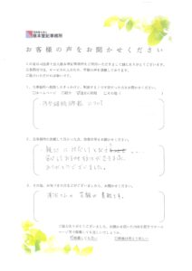 お客様の声 No.8 2025年11月12日 最終更新日時 : 2025年11月12日 根本登記事務所 この度は○○の件につき、お骨折りを頂き大変お世話に成りました。 お陰様で思ってたより早く終了した事に改めて心より深く感謝申し上げますと同様に、ほっと致しました。 本当にありがとうございました。